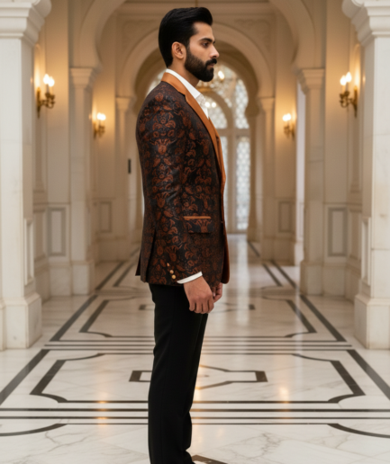 Men’s Premium Rust & Black Damask Jacquard Party Blazer – Slim Fit Tuxedo with Satin Shawl Lapel