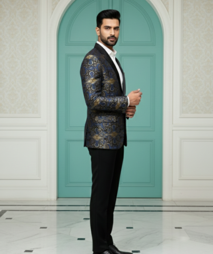 Midnight Blue & Gold Royal Paisley Jacquard Tuxedo Blazer