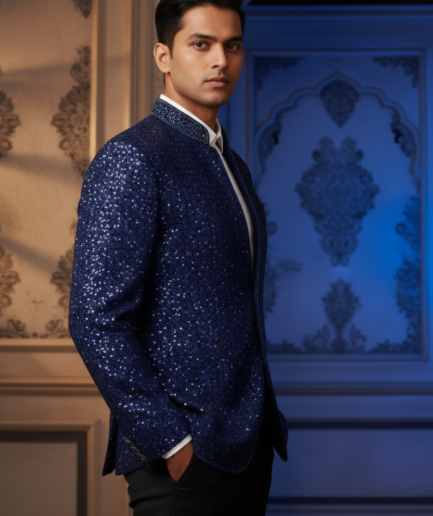 Midnight Navy Sequin Enchantment Blazer – Luxury Hand-Beaded Mandarin Collar Tuxedo