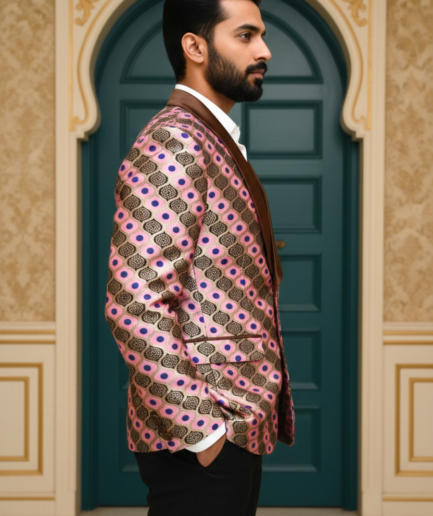 Men’s Rose Pink & Bronze Banarasi Jacquard Tuxedo Blazer – Premium Ethnic Fusion Wear