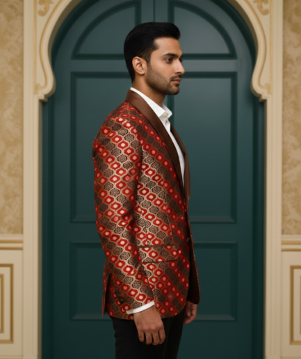 Men’s Red and Gold Brocade Tuxedo Blazer – Ethnic Geometric Jacquard Wedding Jacket