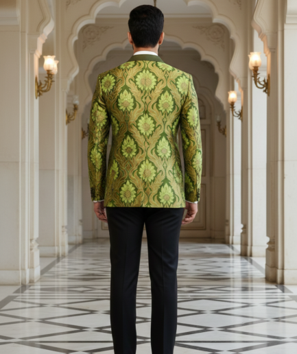 Men’s Emerald Green & Gold Floral Jacquard Tuxedo Blazer – Premium Slim Fit Party Wear Dinner Jacket