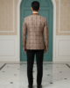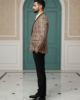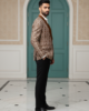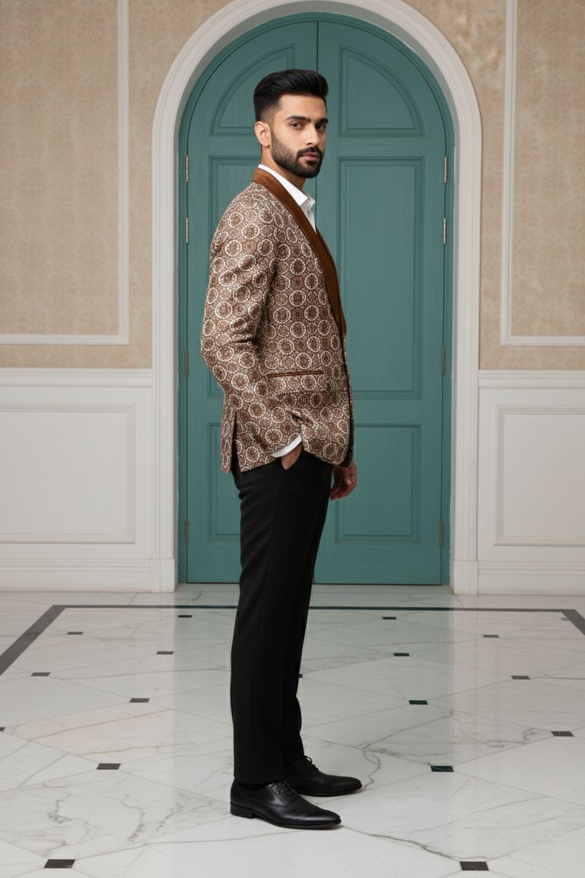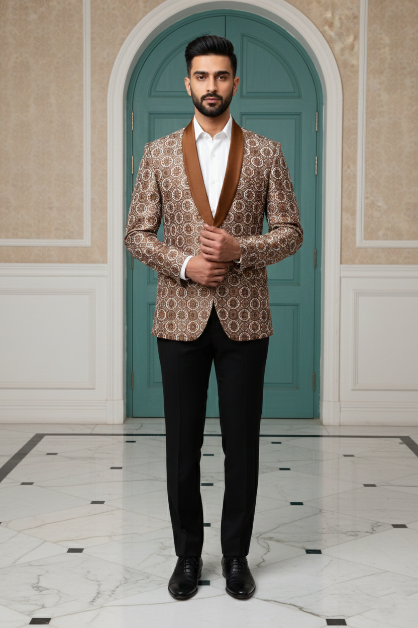 Elevate your evening wardrobe with this sophisticated fusion blazer. Crafted from a rich, metallic-toned silk jacquard, the jacket features an intricate, all-over geometric circular pattern that catches the light with every movement. The silhouette is anchored by a contrasting bronze satin shawl lapel, offering a luxurious texture play that bridges the gap between traditional heritage and contemporary formalwear. Tailored for a slim, structured fit, this piece is designed for the modern gentleman looking to make a statement at weddings, galas, or festive celebrations.