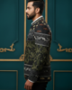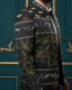 Step into the spotlight with this masterpiece of modern Indian couture. This Black Bandhgala Blazer is defined by its unique, multi-layered embroidery that tells a story of nature and elegance. The upper yoke is detailed with golden wildlife motifs, transitioning into a lush landscape of olive green and silver floral thread-work.