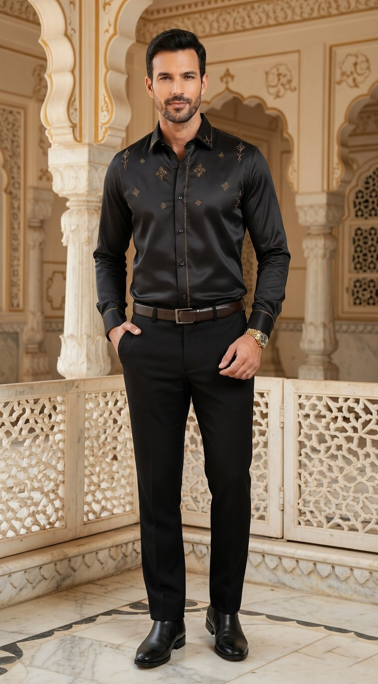 Redefine formal elegance with this stunning designer dress shirt in a rich charcoal black. Adorned with delicate gold-tone embroidery, it features a unique blend of geometric patterns and subtle floral filigree across the chest and collar. This piece is crafted for the man who wants to stand out with understated luxury, offering a custom-tailored look that pairs perfectly with black formal trousers and leather Chelsea boots.