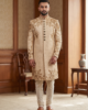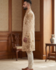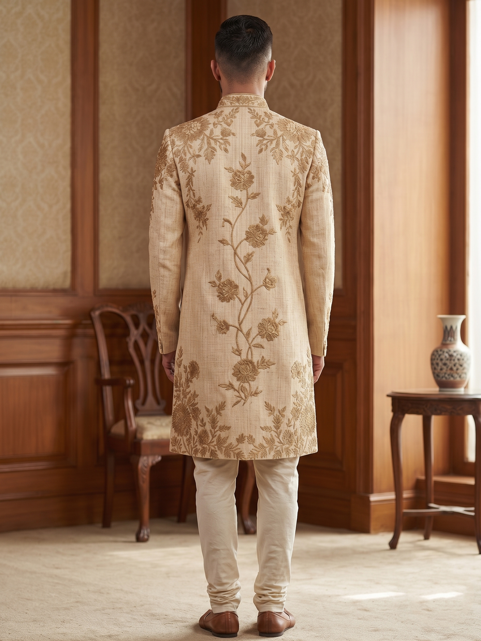 This image showcases a sophisticated men’s Sherwani in a timeless beige or light cream hue, expertly crafted for formal celebrations such as weddings or festivals. The garment features a refined Mandarin collar and a structured, knee-length silhouette that exudes regal charm.