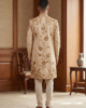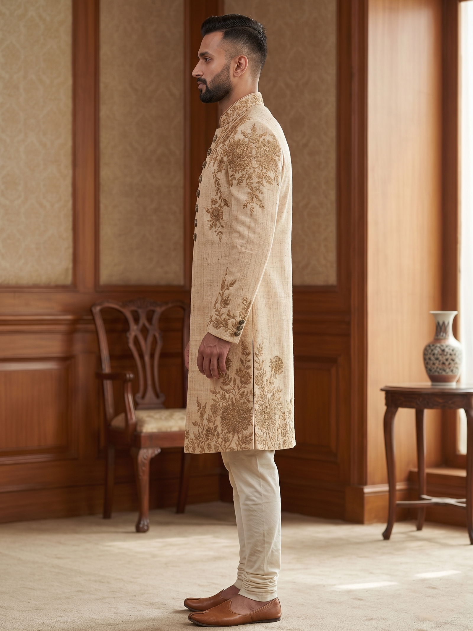 The artistry lies in the intricate antique gold floral embroidery, which is strategically placed across the shoulders, chest, and sleeves, cascading down to a heavily embellished hemline. The textured fabric adds depth to the outfit, while the center-front placket is adorned with a row of ornate metallic buttons, providing a classic finishing touch. This ensemble perfectly balances traditional Indian craftsmanship with a modern, tailored fit, making it an ideal choice for a groom or a high-profile guest.