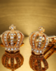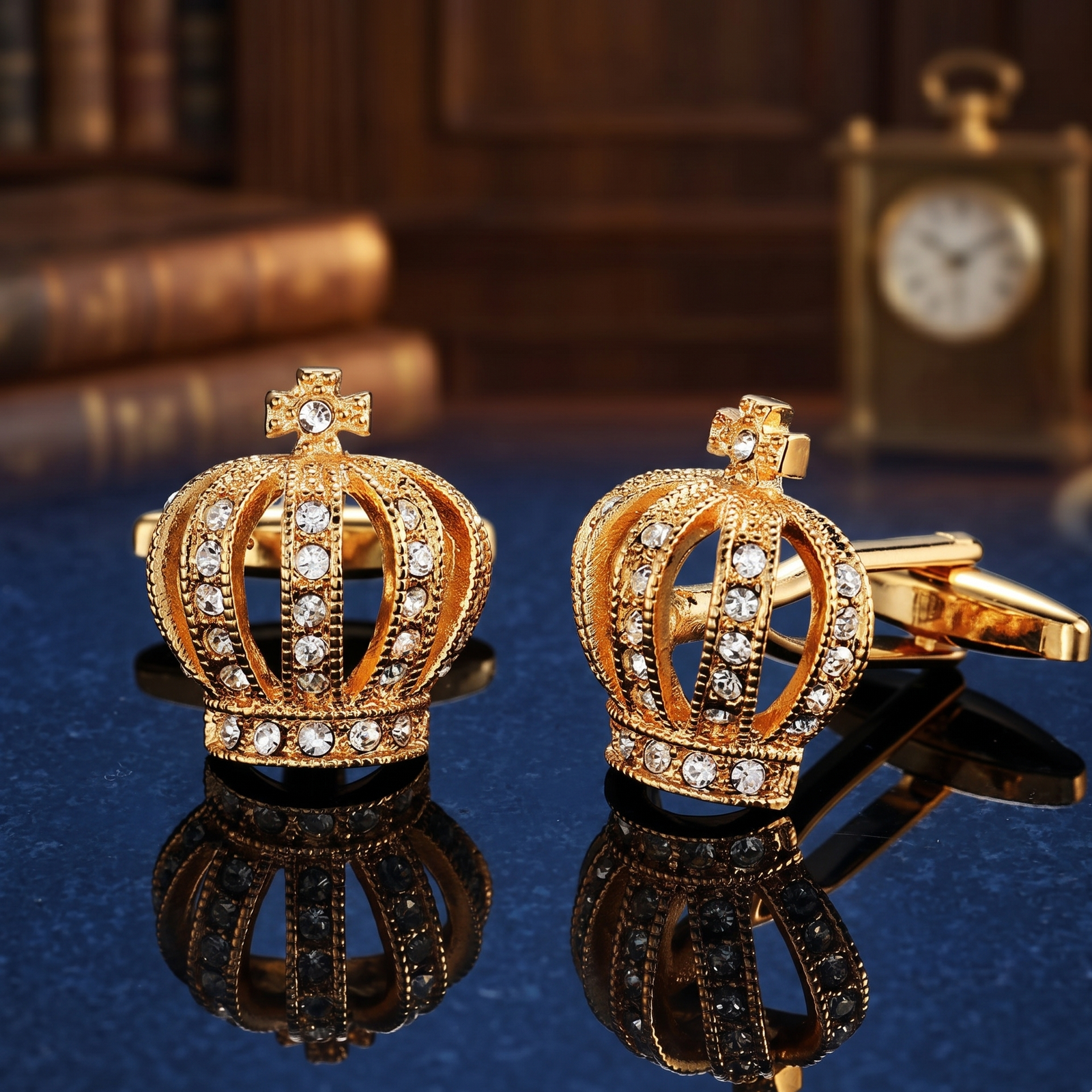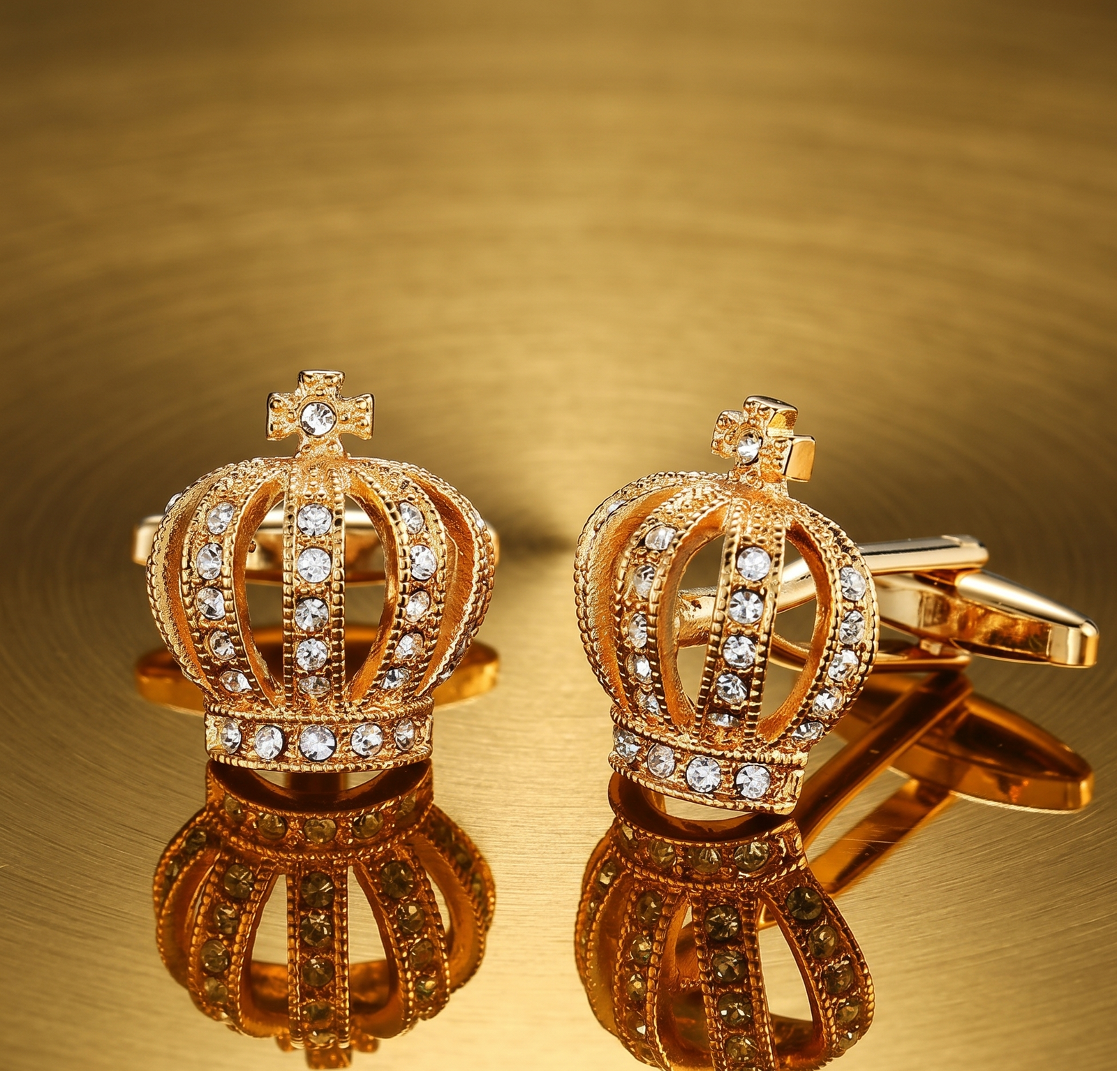 This image features a pair of exquisite gold-toned cufflinks designed in the shape of regal imperial crowns. Resting on a highly reflective, brushed gold surface, the cufflinks are captured in a warm, amber glow that emphasizes their luxurious aesthetic. Each crown is meticulously crafted with intricate filigree work and embellished with numerous clear, sparkling crystals (likely cubic zirconia or rhinestones) along the arches and the base. A small, jeweled cross surmounts each crown, adding to the traditional monarchical silhouette.