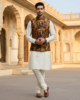 appreciate classic ethnic fashion with a bold touch. The jacket features a rich, dark base