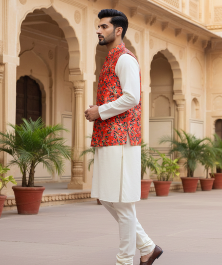 Paired with a soft ivory kurta and pajama, this ensemble balances vibrancy and sophistication