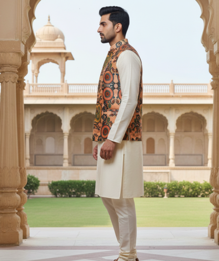 Men’s Dark Floral Nehru Jacket with Ivory Kurta Pajama – Contemporary Festive Wear