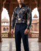 Redefine your evening aesthetic with this avant-garde designer statement shirt. Featuring a bold, large-scale abstract fragment print, this piece showcases a sophisticated interplay of matte midnight navy and shimmering burnished bronze. The “shattered” geometric pattern is designed to catch the light at different angles, creating a dynamic, high-fashion look.