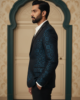 Men’s Designer Teal & Black Geometric Jacquard Tuxedo Blazer – Premium Ethnic Evening Wear