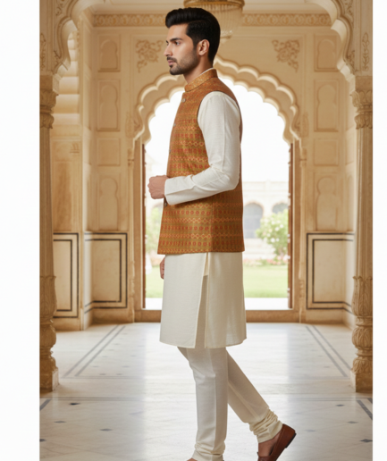 Men’s Floral Nehru Jacket with Ivory Kurta Pajama – Elegant Festive & Wedding Wear