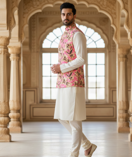 Men’s Ivory Floral Print Nehru Jacket with Kurta Pajama – Elegant Festive Wear