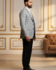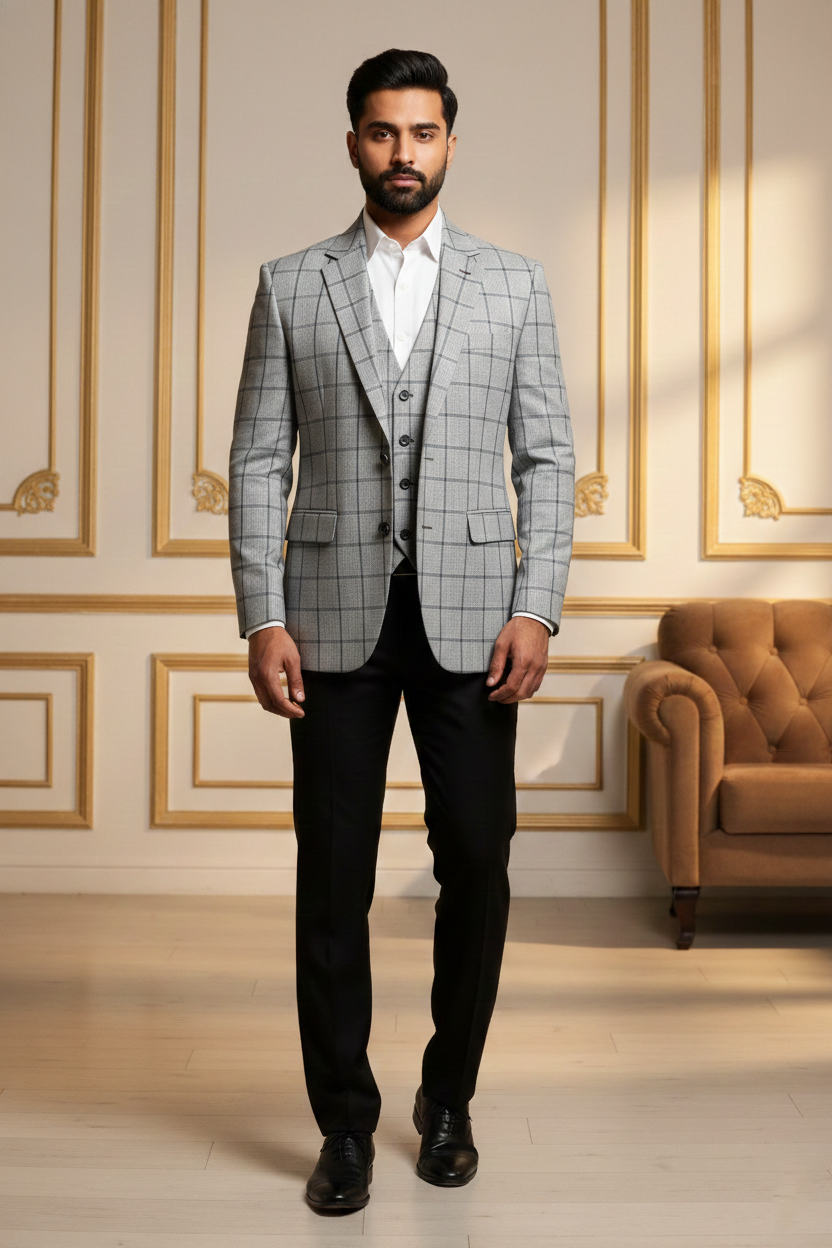 Elevate your formal wardrobe with this sophisticated Light Grey Windowpane Blazer. Designed for the modern gentleman, this jacket features a striking charcoal grid pattern that adds visual depth without being overwhelming.