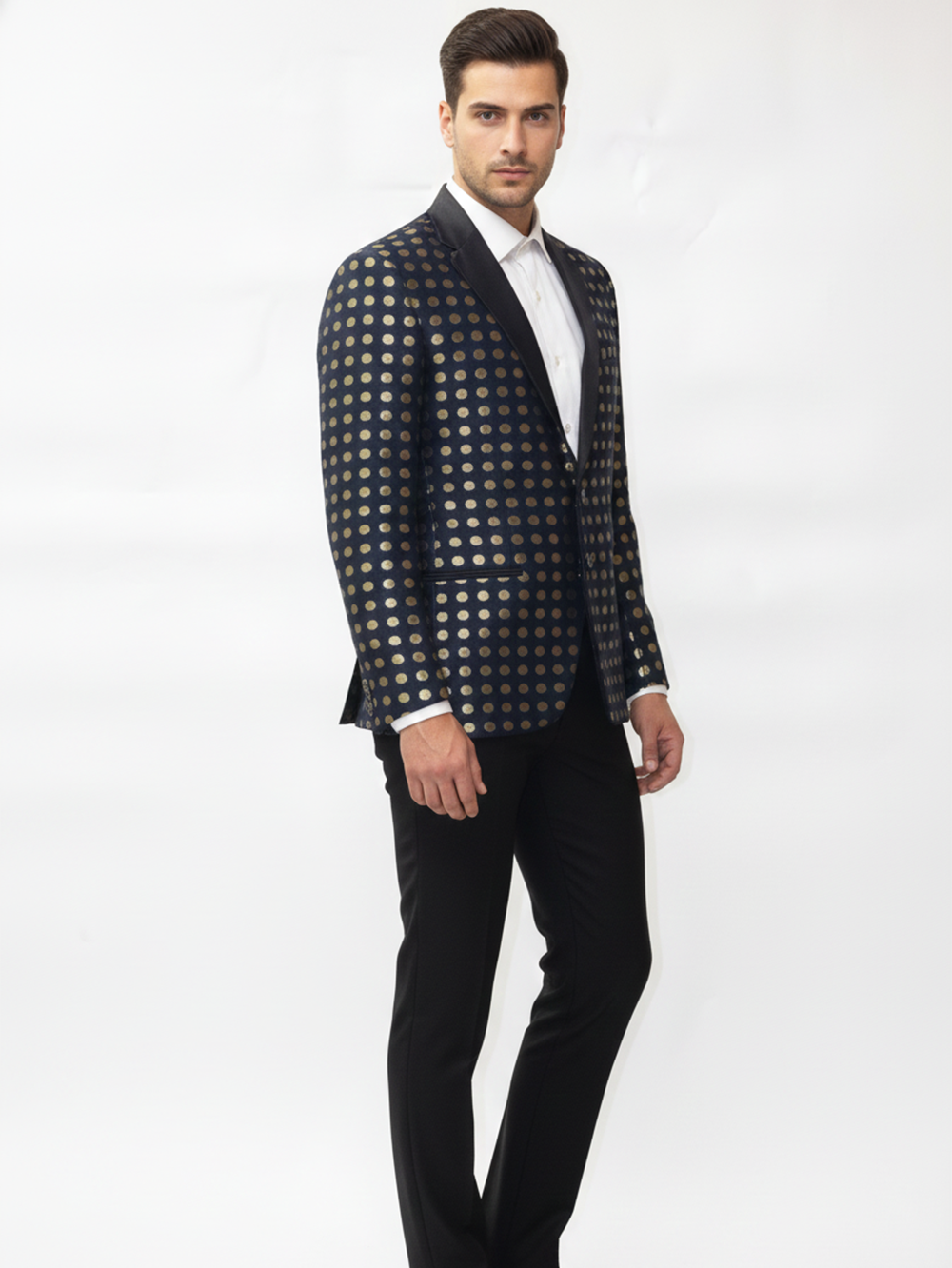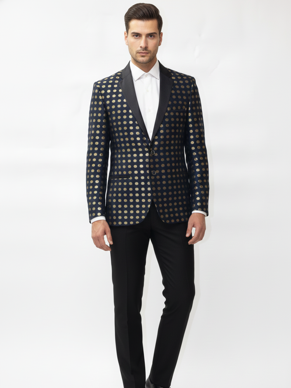 Men’s Luxury Polka Jacquard Tuxedo Blazer – Black & Gold Evening Jacket