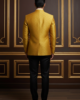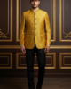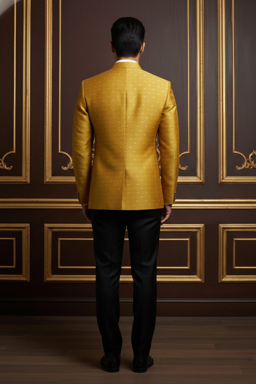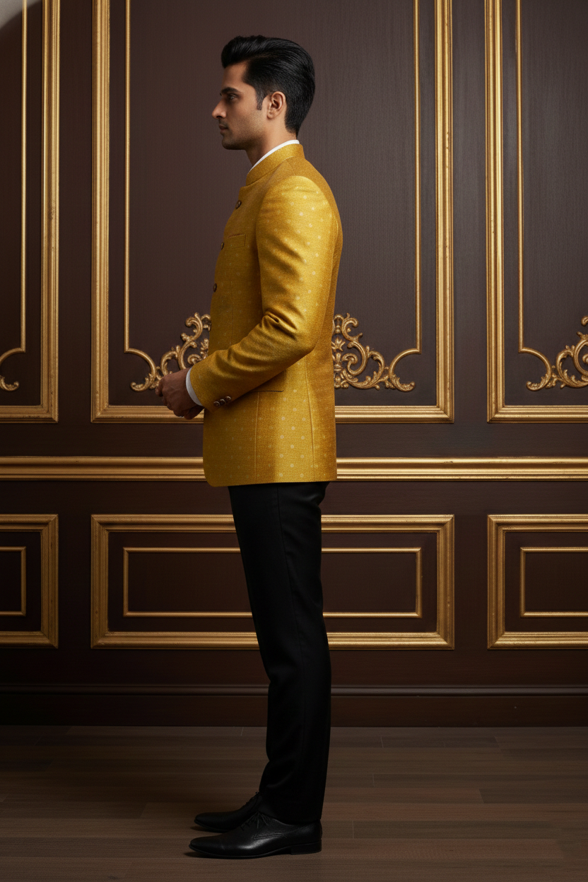 Men’s Mustard Yellow Woven Jacquard Bandhgala Blazer – Premium Silk Blend Ethnic Jodhpuri Suit
