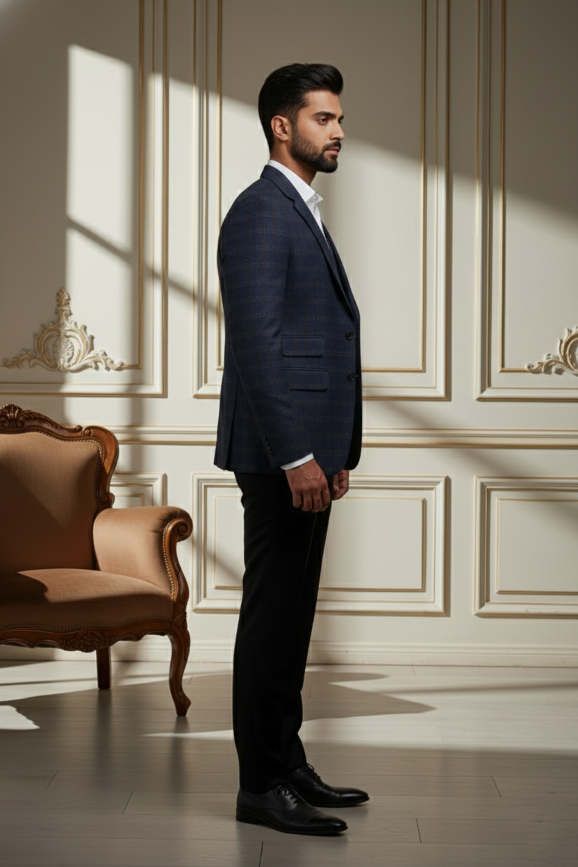 Define your formal aesthetic with this Navy Micro-Check Blazer, a versatile piece designed for premium e-commerce catalogs. The deep blue fabric is detailed with a fine, contrasting grid pattern that reveals its complexity under the light.