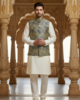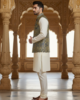 neutral ivory kurta pajama balances the ornate jacket perfectly. Ideal for weddings, festive