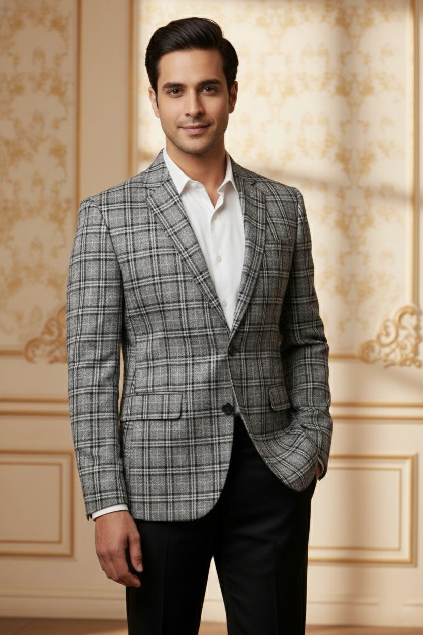 Men’s Premium Grey Glen Plaid Blazer – Slim-Fit Checked Formal Sport Coat for Business & Weddings