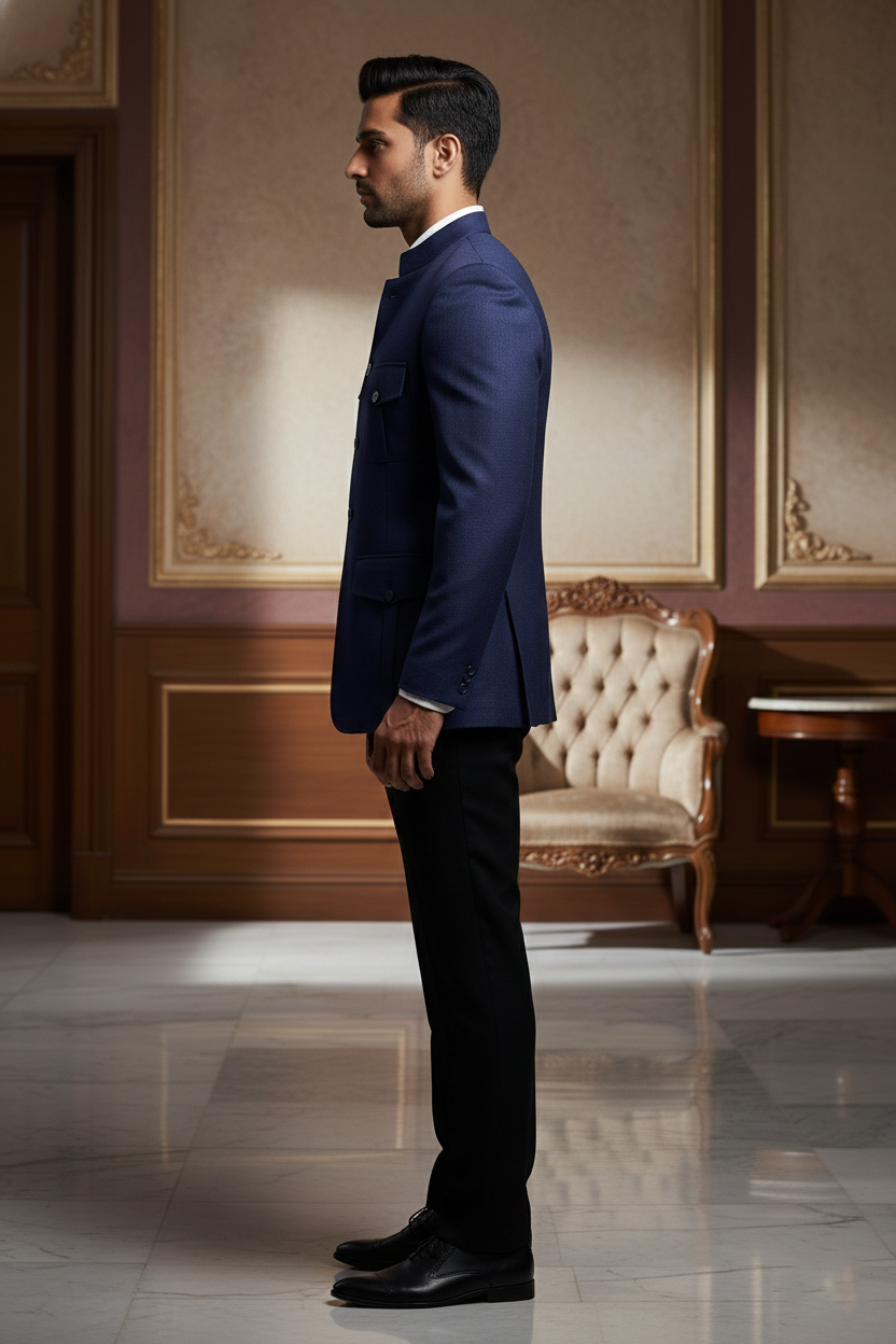 Redefine heritage with a modern military edge. This sophisticated navy blue Bandhgala jacket combines the structured grace of traditional Indian attire with the functional aesthetic of a classic safari jacket. Crafted for the modern man who values both style and utility, this piece is an exceptional choice for semi-formal weddings, festive gatherings, or upscale evening events.