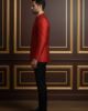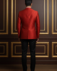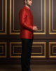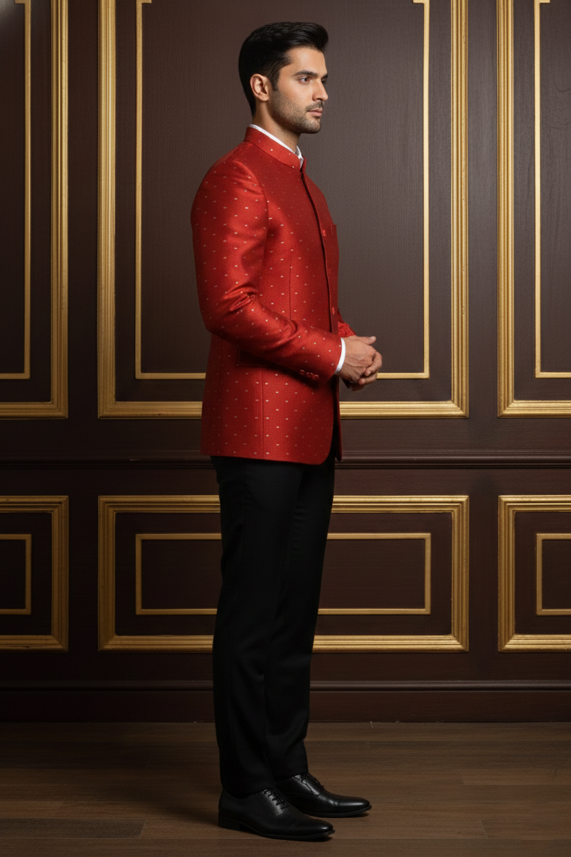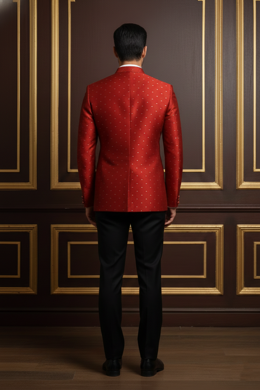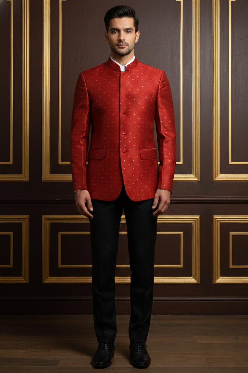 Elevate your festive wardrobe with this impeccably tailored Red Bandhgala Blazer. Crafted from high-quality jacquard silk, this blazer features a subtle, gold-toned self-pattern that adds a touch of regal sophistication. The structured silhouette and classic mandarin collar (Jodhpuri style) offer a sharp, modern fit while honoring traditional Indian craftsmanship.