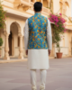 Men’s Royal Blue Floral Nehru Jacket with Ivory Kurta Pajama – Festive Ethnic Wear