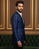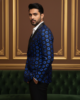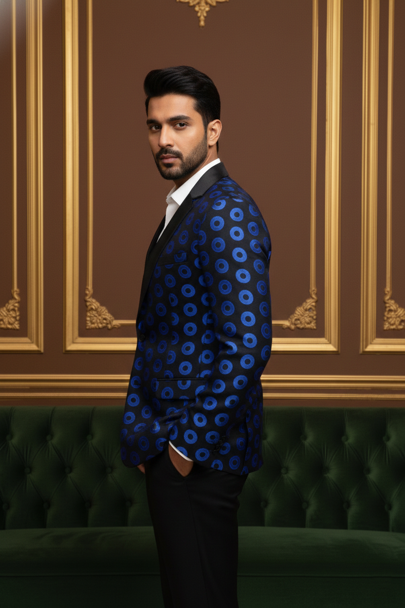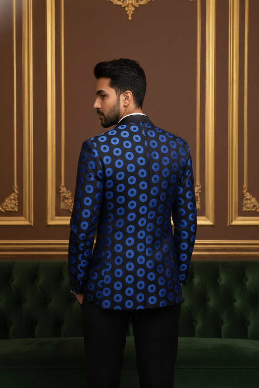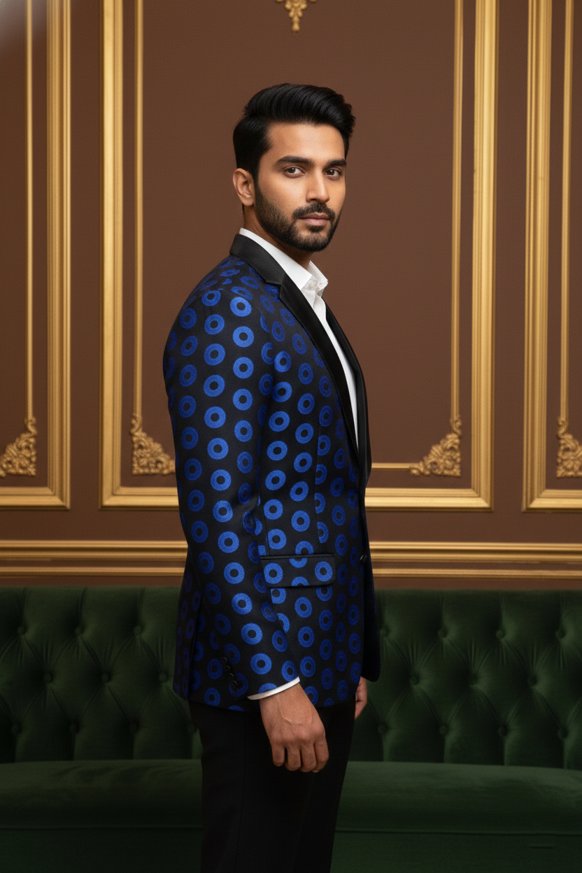Elevate your evening wardrobe with this striking Royal Blue Designer Blazer. Featuring an eye-catching, high-definition geometric circle print, this blazer is designed for the man who isn’t afraid to stand out. The sleek black satin shawl lapel provides a sophisticated contrast, making it an ideal choice for weddings, cocktail parties, and high-profile events. Tailored in a modern slim fit, it offers a sharp silhouette that pairs perfectly with black formal trousers and a crisp white shirt.
