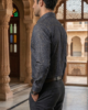 Crafted for the modern professional, this sophisticated button-down features a deep midnight navy base adorned with a meticulous micro-geometric medallion print. The shirt stands out with its subtle bronze-tone contrast stitching along the placket, collar, and cuffs, adding a rugged yet refined edge to the tailored silhouette.