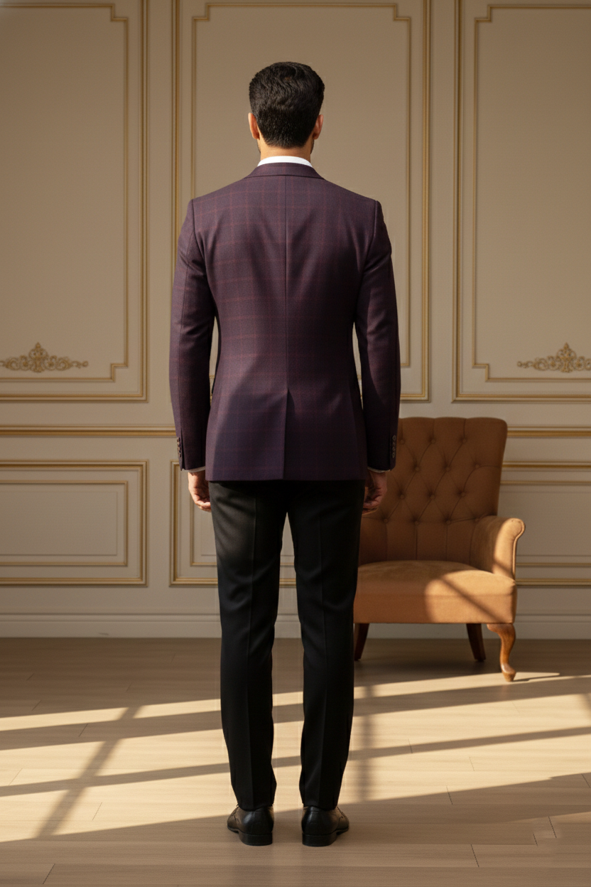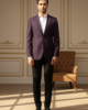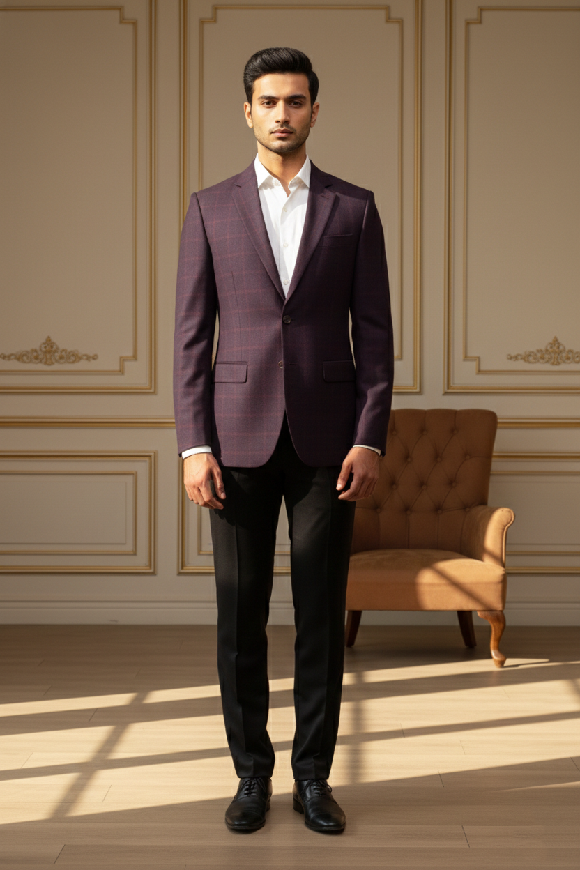 Elevate your evening wardrobe with this meticulously tailored single-breasted blazer. Featuring a rich plum hue accented by a subtle windowpane check pattern, this piece strikes the perfect balance between classic heritage and modern flair. Crafted in a refined slim fit, it provides a sharp silhouette that transitions effortlessly from high-stakes boardroom meetings to upscale social events. Pair it with black tailored trousers and a crisp white shirt for a polished, contemporary aesthetic.