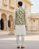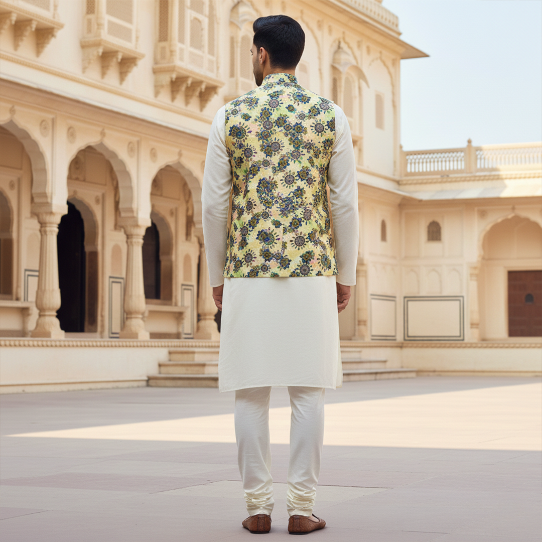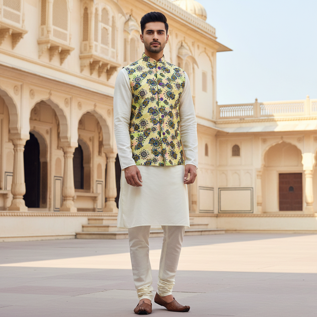 Men’s Yellow Floral Nehru Jacket with Ivory Kurta Pajama – Elegant Festive Ethnic Wear