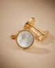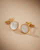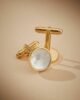 This image features a pair of elegant, circular cufflinks that blend classic sophistication with a modern, clean finish. Each piece is crafted with a polished gold-toned metal setting, providing a warm and luxurious frame. The centerpiece is a smooth inlay of iridescent white mother-of-pearl, which displays a soft, cloud-like luster and subtle color shifts when it catches the light.