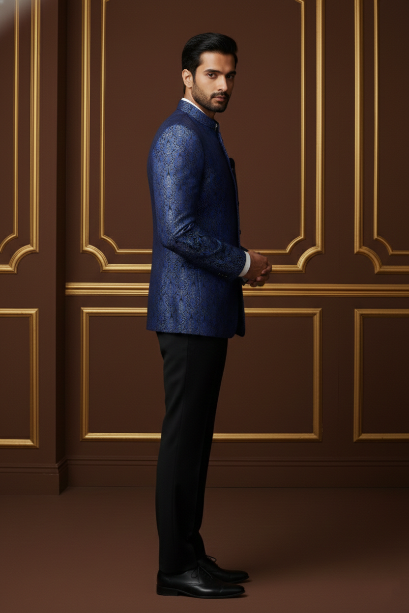 Exude timeless elegance with this Royal Blue Bandhgala Blazer, a perfect fusion of traditional heritage and modern tailoring. Crafted from premium brocade fabric, it features an intricate self-textured jacquard pattern that catches the light with a subtle sheen. The structured silhouette and high mandarin collar (Bandhgala) offer a commanding presence, making it an ideal choice for weddings, galas, and high-profile formal events.