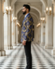This premium tuxedo blazer is a masterpiece of fusion fashion, blending the rich textile heritage of India with contemporary European tailoring. Crafted from exquisite Banarasi silk brocade, it features a complex gold and royal blue floral motif known as Zari work. The sharp, slim-fit silhouette is grounded by solid navy silk lapels, making it an ideal statement piece for weddings, galas, or high-profile red-carpet events.